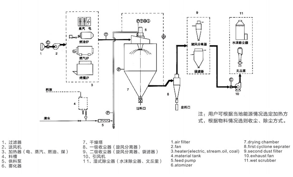 1、熱氣流與霧滴的接觸:有足夠量的熱氣流進(jìn)入噴霧干燥室時(shí),必須考慮熱氣流的方向及角度,無論是并流、逆流還是混流,確保與霧滴的充分接觸,才能進(jìn)行充分的熱交換。